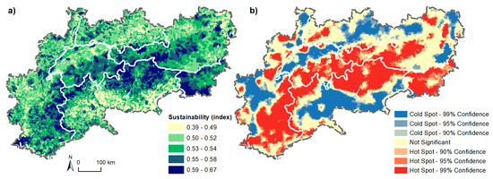 - We calculated mean sustainability values for the three single dimensions (economy, society, environment) and a total sustainability value (mean of the single dimensions) distinguishing between the areas within and outside the hot spots of each ES to evaluate whether ES hot spots correspond to higher levels of sustainability. We used a t-test (equal variances not assumed; sig. level = 99%, bootstrapping: n = 200) to check whether the ES hot spots differed significantly in terms of sustainability.
