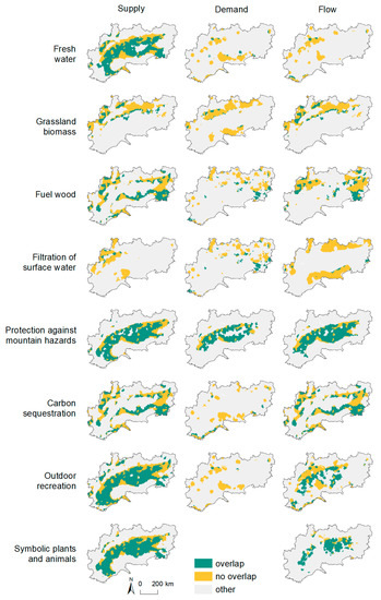 - Schirpke, U.; Candiago, S.; Egarter Vigl, L.; Jäger, H.; Labadini, A.; Marsoner, T.; Meisch, C.; Tasser, E.; Tappeiner, U. Integrating supply, flow and demand to enhance the understanding of interactions among multiple ecosystem services. Sci. Total Environ. 2019, 651, 928–941. [Google Scholar] [CrossRef]