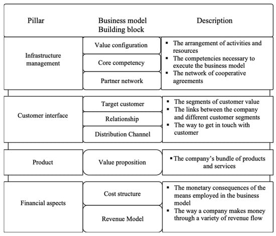 As mentioned earlier, business models are a strategic tool for organizations regarding how they intend to gain profit and communicate with internal and external stakeholders []. Business models relate to the value chain and describe the process of the sale of products, distribution and delivery, and how organizations perform services to the customer []. In a study from 2005, carried out by Osterwalder, Pigneur, and Tucci [], they discuss four pillars and nine-building blocks for business models (see Figure 1). They call these pillars “product, customer interface, infrastructure management, and financial aspects” (p. 10), and argue how companies should give each building block attention in the value creation. For example, the customer interface describes how companies should target its customers, what distributions channel are used for customer interaction, and how the customer’s relationships might differ between customer segments. This description of each building block depends on the business type, and each block needs to be tailored for every single organization, their financial aspects, and infrastructure management, such as their network of partners, core competencies, and the value configuration [].