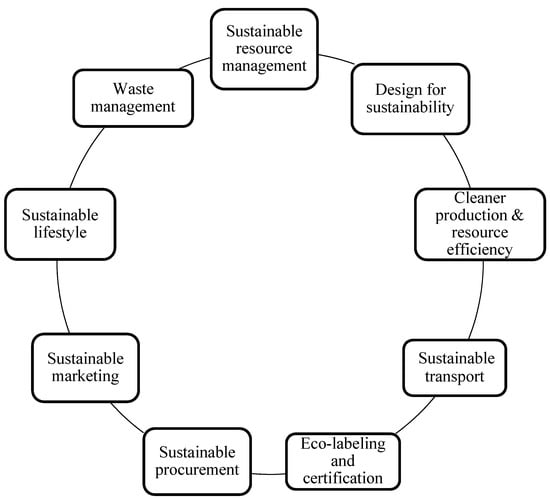 One of the tools that businesses can use to improve sustainability, and to underline the circular economy, is the Sustainable Consumption and Production (SCP) cycle. The SCP cycle has nine “key principle” [] (p. 10), and it encourages a circular way of thinking by supporting environmentally friendly consumptions, with a focus on resource management, design for sustainability, cleaner production and research efficiency, eco-labeling and certification, sustainable marketing and lifestyle, and waste management (see Figure 3). Businesses can use the cycle as a guideline to create a strategy for sustainability in order to improve environmental performance in business models, as it is grounded in life-cycle thinking. It highlights how the manufacturers must think of their production process as cradle-to-cradle (i.e., from raw material to the end use of their product) [].