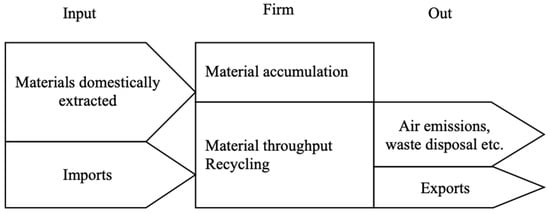 The Ellen MacArthur Foundation [] describes linear processes in business models as “all about take, make waste” (p. 48). Johannsdottir [], discusses the linear process in her study where the closed-loop business models for the “service and manufacturing” (p. 353) sectors are debated. She verifies the need for a different approach for each business sector since their activities requires different “material and energy” [] (p. 353). Three main elements in the linear model in her study are: (1) input, (2) the firm itself and its processes, and (3) the output. The first element in the model, input, defines the material from both domestic and from overseas markets, that companies use in their production. The second element focuses on the firm itself, material throughput, and recycling (see Figure 4). The third factor, the output, shows the effect of waste and emissions from the firms’ production [].