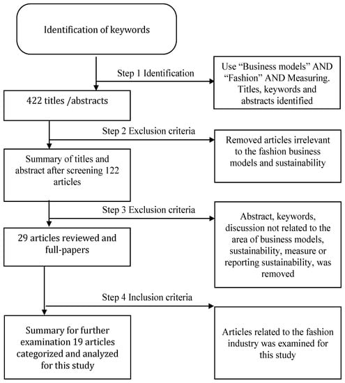 The SLR approach was, in nature, inductive, as categories were modified and classified during the review progress. A delimitated search was performed by the use of inclusion and exclusion search criteria []. The inclusion criteria were; the ProQuest database, as it covers a large share of studies available, full-text and peer-reviewed papers written in English, keywords are “Business model” and “Fashion” (quotation marks were included in order to prevent the possibility of the database excluding articles for writing style). In the second part, keywords were combined using and Sustainability and Measuring. Publication period was set from 2000 to 2018. The exclusion criteria at this stage were papers written in another language than English, published in scholarly before the period in question, as the search did not yield any papers related to sustainability within the fashion industry before 2000. This period should; therefore, cover relevant papers in the field. The first step that was performed on ProQuest with the specific keywords “Business model” and “Fashion” and Sustainability and Measuring, got 422 hits. After reading titles and abstracts, a number of articles were excluded, since they were unrelated to fashion business models and sustainability. In the second step, 300 papers were excluded after reading titles, abstracts, and keywords, as the papers did not relate to the concept of business model, sustainability, measuring, or reported sustainability. During the third step, 29 articles were analyzed further by reading titles, abstracts, keywords, and conclusions related to the topic (see Figure 5). Finally, in the fourth step, authors carefully read through the 29 selected papers for their compatibility to scope of the study. Ten papers were removed. After the examination, 19 full-text papers were analyzed, reviewed, and grouped regarding the focus of the study.
