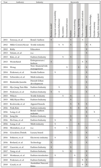 The twelfth article is a systematic literature review carried out by Yang, Song, and Tong []. They used the following keywords to search for articles: sustainable OR sustainability AND retailing OR retail in the first step of the search. In the next step they used; fashion OR textile OR cloth OR clothing OR clothes, which resulted in 48 articles related to the fashion industry. The purpose of the study was to gather information from published literature regarding sustainability within the fashion industry. They suggest that, despite consumers’ awareness, primarily raised after 2006, related to social responsibility, economic sustainability, and environmental protection, the increasing purchasing of clothing affects the “sustainable development of fashion retailing” negatively (p. 1). They emphasized how the main focus in previous studies, regarding sustainability within the fashion sector, centers around developed western markets, thus drawing the attention to the “gap between the practical needs and the relevant research in developing the market” (p. 13). The researchers attempted to evaluate the impact of sustainability-related issues that are growing within the fashion industry, where the industry is neither providing detailed information on sustainability and environmental problems caused by the industry nor emphasizing ethical products [].