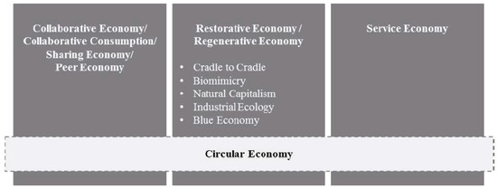 Circular economy and the entailment of sub-included economic approaches (after Laura Frodermann, 2018 [12]).