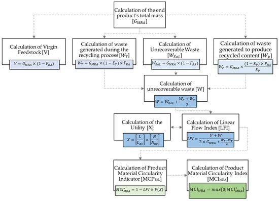 With the aim of assessing the circularity of the end-product, a tailored and analytical method has been developed, whose steps are illustrated in Figure 5, according to the framework developed by the Ellen MacArthur Foundation [52]. The input data has been acquired by calculating the mass of the end-product [GMRA], which is equal to the mass of the dismantled pavement [G], along with the required virgin feedstock [V] and the mass of the reclaimed asphalt collected after dismantling [GRA]. Further inputs are the fraction of the recycled material expressed as a mass ratio between the end-product and the RA [PRA], the fraction of the product collected for recycling at the end of service-life [FRA], the efficiency of the recycling process at stage 1, the treatment of the RA [ET] and the efficiency of the recycling process at stage 2, and the production of the asphalt mixture [EP]. Finally, the amount of waste produced at the End-of-Life of the pavement [WEoL], along with the amount of waste produced from the treatment of the RA [WT] and the amount of waste originating from the production of the asphalt mixture [WP], are required. The total amount of waste [W] is also taken under consideration for the calculation of the Linear Flow Index (LFI), which measures the potential linearity of the end-product. LFI, along with the Utility [X] of MRA’s, defines both the Product Material Circularity Indicator (MCI*MRA) and the Product Material Circularity Index (MCIMRA).