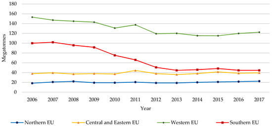 From the results presented in Table 4, it can be seen that there is a significant deviation between the available RA and the RA that is actually utilized in HWMA production, indicating an inadequate process of managing and exploiting the RA produced. This leads to an inefficiently circular approach of asphalt mixture production. The availability and the actual exploitation of RA have slowly and steadily increased in Northern and Western EU sections from 2006 to 2017, while for the Southern and Central and Eastern EU, the actual utilization of RA in HWMA production is almost the same over time. Moreover, in Figure 10, the total HWMA production per year and EU major region are compared to the total RA availability.