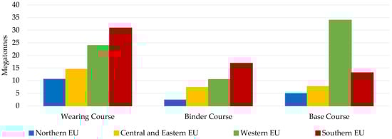 Hence, it can be safely deduced that the annual HWMA production for the Northern EU has remained almost static from 2006 to 2017, accounting for approximately 20 Megatonnes per year. The situation for Central and Eastern EU is quite similar in terms of its trend over the years, but with a higher average annual production, reaching about 40 Megatonnes. In the Western EU, the HWMA production has decreased over the years, starting from approximately 155 Megatonnes in 2006 and dropping to 120 Megatonnes in 2017, experiencing a decline of 23%. Moreover, in Southern EU the HWMA production in 2006 accounted for almost 100 Megatonnes and experienced a significant decrease of 50% by 2017, when approximately 50 Megatonnes of HWMA mixtures were produced. In terms of the average utilization of these mixtures, from Figure 9, it becomes obvious that the main pavement component in which they are utilized is the wearing course, followed by the base course, and finally the binder course. This fact emphasizes the high demand of asphalt mixture production addressed to wearing courses, indicating that surface layers are the largest “end-users” of asphalt mixtures and that most of the established rehabilitation regimes, including resurfacing or interventions, are focused on the wearing courses. In detail, especially in the Southern EU, where Italy is allocated to, more than 51% of the total HWMA production is intended for use in surface courses, and also according to the Italian regulations [63,64], the wearing course is the layer that experiences the lower allowed margin in terms of RA quantity, accounting for merely 20%.