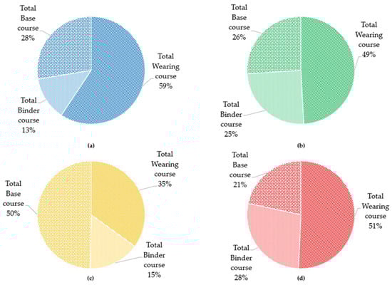Average Percentage Distribution of Hot and Warm Mix Asphalt uses per pavement layer in: (a) Northern EU (2006–2017); (b) Western EU (2006–2017); (c) Central and Eastern EU (2006–2017); (d) Southern EU (2006–2017).
