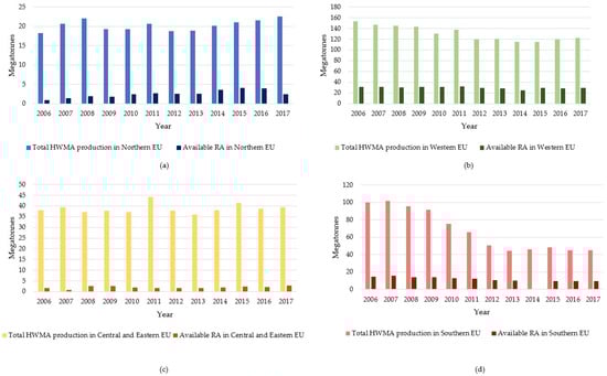 Comparison between the total annual Hot and Warm Mix Asphalt production and the annually available RA in: (a) Northern EU (2006–2017); (b) Western EU (2006–2017); (c) Central and Eastern EU (2006–2017); (d) Southern EU (2006–2017).