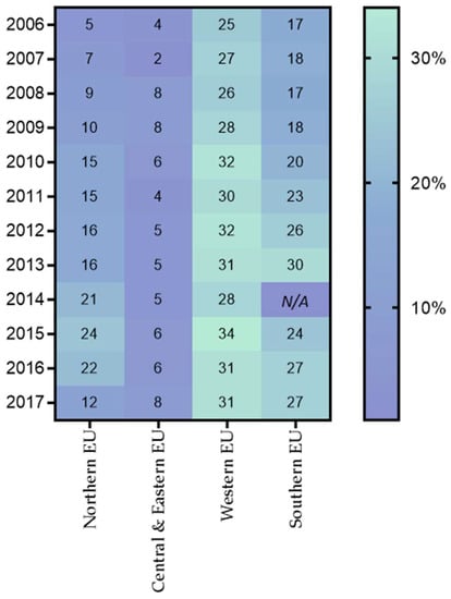 In this study, in order to effectively assess the capacity of RA recycling on a European scale, reputable sources of data were utilized. All of the data needed for the realization of this part of the study was collected from the European Asphalt and Pavement Association (EAPA), through its annual reports, entitled “Asphalt in Figures” [28,29,30,31,32,33,34,35,36,37,38]. The analysis has been performed from 2006 to 2017. However, in order to make the results of the study more cohesive and consistent, Europe was divided into four major regions, increasing the homogeneity and the geographical representation of the data. The division was performed according to Eurovoc, and thus, the European Union’s guidelines, and it can be seen in Figure 3 and is further analyzed in Table 1.