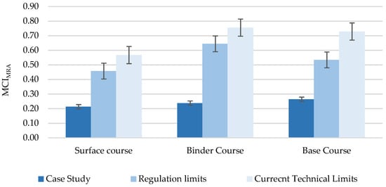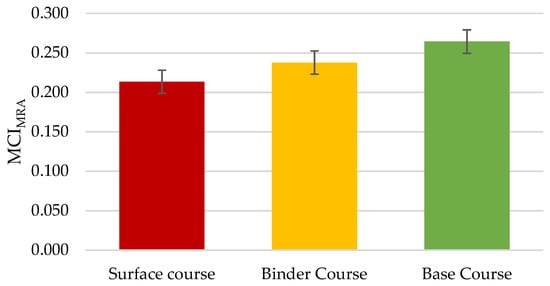 Having identified the weakness, in terms of circularity and sustainability, of the re-circulation process of RA into new asphalt pavements’ product systems, naturally, the next step that was undertaken was to quantify the levels of circularity of asphalt pavements themselves. To do so, the MCIMRA of the three basic bituminous layers of the asphalt pavements, namely, wearing, binder, and base course, constituting the motorway network of Italy, was quantified. For the quantification of the circularity levels of the pavements, the tailored Material Circularity Index Methodology was utilized, as described in Section 3.2. Finally, in Table 6, the final outputs of the calculation can be found, and are presented in Figure 12.