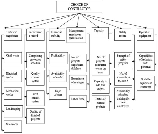 - Capacity (CA)—This will evaluate the projects the contractor is working on (CA1) (less than 5 (<5), from 5 to 10 (5–10), more than 10 (>10), and the ability (capacity) to include this project (CA2) strong (S), moderate (M), and weak (W), as well as ongoing project status (CA3). Evaluation of status of current (ongoing) projects: ahead of schedule (SA), as scheduled (SO), behind schedule (SB), and stopped (SS).