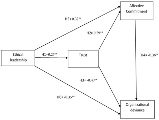 H1 was accepted, asserting a positive effect of ethical leadership on trust (b = 0.230, p < 0.01). The second hypotheses (H2) measured the positive effect of trust on affective commitment. The analysis revealed significant results (b = 0.394, p < 0.01), and consequently H2 was accepted. H3 assessed the significant negative effect of trust on organizational deviance. H4 posited that affective commitment negatively affects deviance behavior of employees. The fifth hypothesis (H5) assessed the positive impact of EL on AC, and, finally, hypothesis 6 measured the effect of EL on deviant behavior. The results of the H3–H6 showed significance, with the following beta values at 99% confidence interval: H3 (b = −0.399, p < 0.01), H4 (b = −0.364, p < 0.01), H5 (b = 0.321, p < 0.01), and H6 (b = −0.346, p < 0.01).
