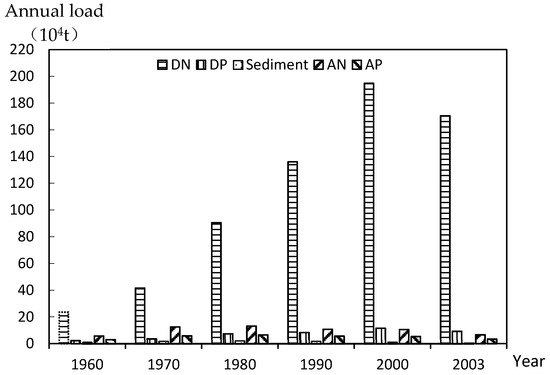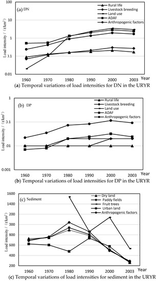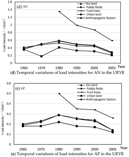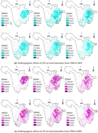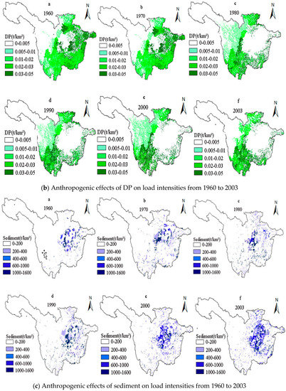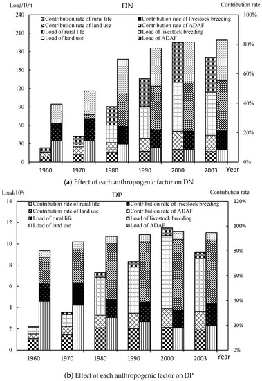 As can be seen in Figure 5, the load intensities for dissolved pollutants caused by anthropogenic factors first increased and then became flat between 1960 and 2003. For DN, the load intensity caused by rural life, livestock breeding and atmospheric deposition showed an increasing trend, and the load intensity caused by land use increased significantly. The load intensity of land use was higher, while load intensities of rural life and livestock breeding were relatively low. Therefore, anthropogenic factors increased the content of DN and enhanced the DN load intensity. For DP, the load intensity caused by anthropogenic factors increased from 1960 to 1980, and did not change much between 1980 and 2000, before decreasing slightly up to 2003. In general, the main causes of this fluctuation were population surge, extensive development of livestock breeding and uncontrolled fertilizer use before 1990 [36]. After 1990, the state implemented some environmental protection policies.