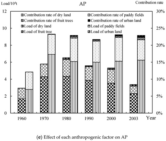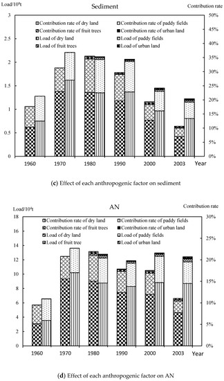Based on the models proposed in Section 2.1 and GIS, the pollution load caused by each anthropogenic factor and the contribution rates to the total load during 1960–2003 were calculated. The effect of anthropogenic factors on NPS pollution in the URYR was analyzed, as shown in Figure 6.