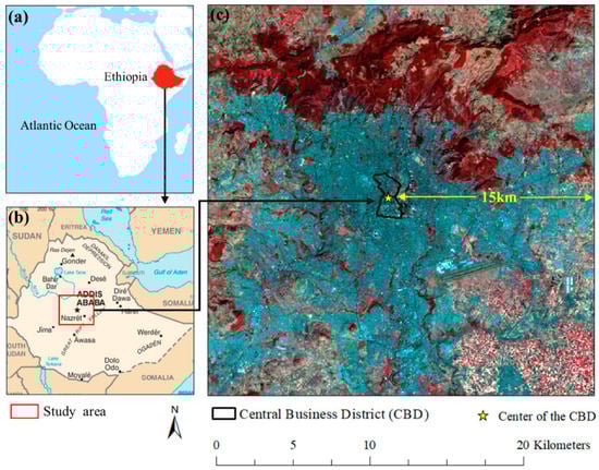 Study area. (a) Map of the African continent showing Ethiopia; (b) map of Ethiopia with Addis Ababa; and (c) Landsat-8 image in a false color composite (band 5, 4, 3) (9 December 2016) with central business district (CBD).