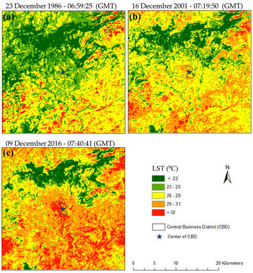Land surface temperature (LST) map of Addis Ababa; (a) LST in 1986; (b) LST in 2001; and (c) LST in 2016.