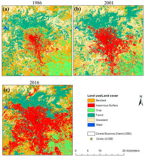 Land use and land cover (LULC) map of Addis Ababa; (a) LULC in 1986; (b) LULC in 2001; and (c) LULC in 2016.
