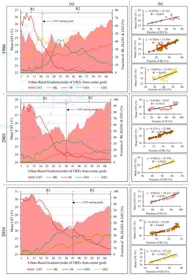 (a) Relationship between LST and LULC composition in 1986, 2001, and 2016; and (b) scatter plot diagram between LST and LULC in 1986, 2001, and 2016. Scatter plot diagrams between mean LST and IS fraction only belongs to R1, and the remaining two belong to R2.