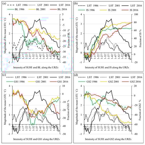 The magnitude of LST along the URZs with a fraction ratio of (a) BL, (b) IS, (c) GS1, and (d) GS2 in Addis Ababa.