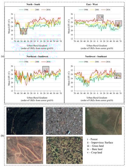 Multidirectional and multitemporal profiles of the LST in Figure 7 show the cross-sectional outline of surface temperature described in Section 2.6. The reason could be that the fraction ratio of IS was weak in 1986 because of a lower degree of urbanization (Table 2), but it matured in 2016, as shown by the increase in IS fraction. Mean LST has declined in the area where natural forest is located (the North and Northwest direction), especially in the central mountain area. Figure 5b shows the types of LULC and their respective geographical locations overlaid onto the multidirectional and multi-temporal LST profile following chronological order.