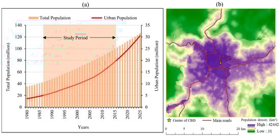 (a) Total and urban population in Ethiopia from 1980–2025 including the forecasted population (2019–2025) [46]; and (b) spatial distribution of the 2006 population with the main transportation line [45].