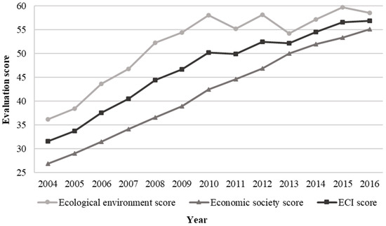 Table 4 shows that the ECI score in mainland China as a whole maintained an upward momentum from 2004 to 2016, and the development stage of ecological civilization turned from a low stage in 2004 to an intermediate stage in 2016. The ecological environment score was constantly higher than that of economic society. While compared with the sustainable growth of the economic society score, the ecological environment score increased year by year from 2004 to 2010, then fluctuated within a range of 54 to 60. From the perspective of the development stage of ecological civilization, 2007 and 2012 were taken as two junctures of time, which were the stages of transition from low to comparatively low, and from comparatively low to intermediate, respectively (although China entered the intermediate development stage of ecological civilization for the first time in 2010, it was not until 2012 that the development stage of ecological civilization was maintained steady at intermediate stage). We saw that China really made great progress in ecological civilization construction in recent years. However, China was still in the intermediate development stage of ecological civilization until 2016, and its ECI score even fluctuated in recent years. This demonstrated that China should close the gap between its ecological civilization development level and that of developed countries and regions, and it should continue to strengthen ecological civilization construction comprehensively in the future [32].