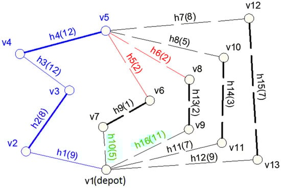 A DH can be applied to either an oriented, disoriented, or mixed complete route , whereby the individual edges are assigned labels representing a connectivity demand or the length of the edge. The capacity of a vehicle is Q. Under the DH, an auxiliary acyclic graph H was created, with points with assigned numeric value in ascending order, starting with 0. Each permissible route from the subset of the complete route is represented by only one or-edge in the H graph. The route is permissible if neither the capacity of the vehicle (Q) nor the L driving range is exceeded. The loading volume on the route is calculated as follows []:
