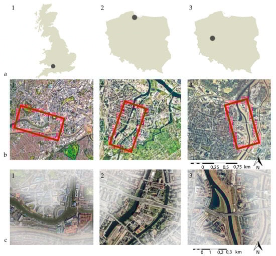 (a) the location of the cities subjected to empirical study: 1—Bristol (England), 2—Gdańsk (Poland), 3—Poznań (Poland); (b) the location of the study areas within the urban structure of the cities; (c) the specified study areas.