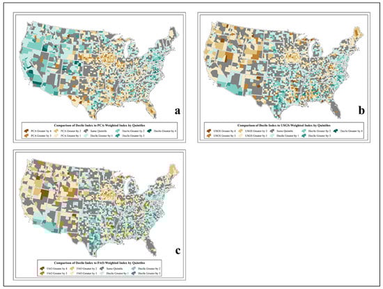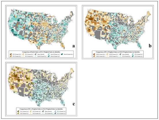 Quintile comparison of PCA index to other derived indices; (a) PCA-weighted index to unweighted decile index; (b) PCA-weighted index to USGS-weighted index; (c) PCA-weighted index to FAO-weighted index.