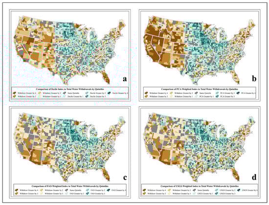 Quintile comparison of total water withdrawals to other derived indices; (a) total water withdrawals to unweighted decile index; (b) total water withdrawals to PCA-weighted index; (c) total water withdrawals to FAO-weighted index; (d) total water withdrawals to USGS-weighted index.