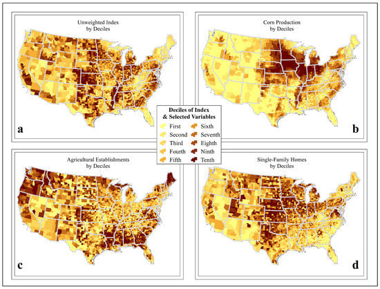 Decomposition analysis of decile index and leading variables; (a) unweighted decile index by decile groups; (b) tons of corn produced per square mile by decile; (c) agricultural establishments as a percent of total establishments by decile; (d) single-family homes as a percent of total housing units by decile.