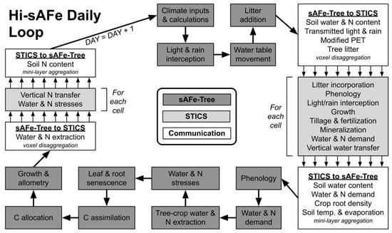 Hi-sAFe simulates a 3D agroforestry environment by coupling the existing STICS (version 8) crop model [22,45] with a new tree model (sAFe-Tree) on a daily time-step (Figure 1). The integration of STICS and sAFe-Tree occurs via three tree–crop interaction modules that govern the dynamics of light, water, and nitrogen via simple, well-established equations. Hi-sAFe is written in Java and runs on the Capsis platform [46].