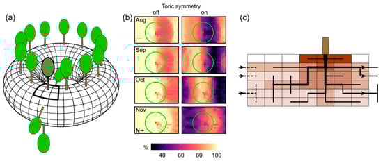 Ray interception is integrated over the scene to obtain the radiation and photosynthetically active radiation (PAR) intercepted by individual trees and transmitted to each cell in the scene. With PBC enabled, shading is transmitted to the opposite side of the scene (Figure 3b).