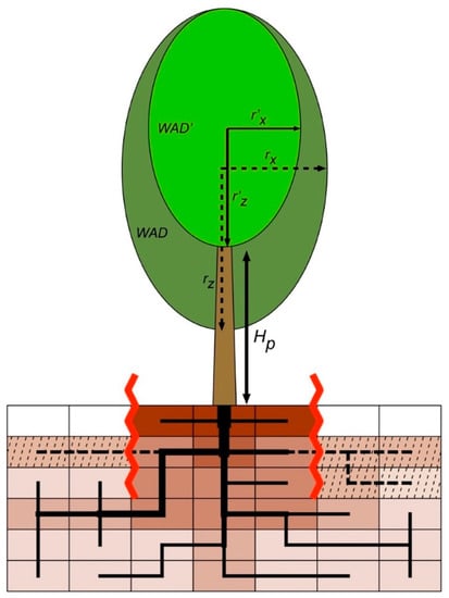 The algorithm for tree–crop competition for water uptake extends the approach of de Willigen et al. [57] to include any number of plants with overlapping root systems. This algorithm requires seven parameters for each plant and provides a global solution to water uptake without assuming an advantage by one species, taking full advantage of the dynamic tree root topology in Hi-sAFe. Full details on the algorithm are available on the Hi-sAFe website [58], but a summary is provided below. The algorithm is similar to one in WaNuLCas [36], but is extended to be 3D.