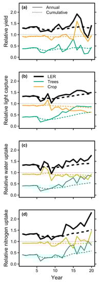 Agroforestry, the intentional integration of trees with crops or livestock, has gained momentum in temperate regions over the last few decades [1,2,3]. Temperate agroforestry research, however, has lagged behind work in the tropics and subtropics [4,5]. At the core of agroforestry research are the interactions between trees and crops, which drive differences from monoculture cropping systems and pure forestry stands. These interactions can lead to both positive and negative effects when mixing trees and crops in agroforestry. In many environments, interaction between trees and crops can result in overyielding in agroforestry compared to tree and crop monocultures [6,7,8]. Agroforestry system design can exploit these benefits to create economic advantages [9,10,11], but requires specific knowledge on the complex tree–crop interactions.