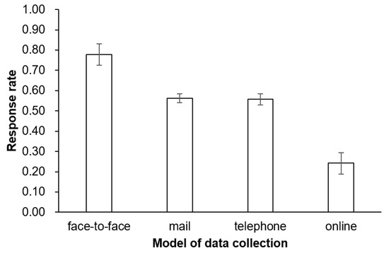 Although there are a number of modes of data collection or survey methods including face-to-face interviews, mails, telephone, internet, e-mail, or other social media platforms, previous research has demonstrated that response rates varied from high to low for three modes of data collection: Face-to-face interviews, mail surveys, and telephone or web surveys [57,58,59].We coded our studies into four major categories: Face-to-face interviews, mail surveys, telephone, and online surveys.