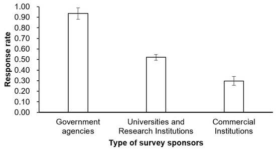 The type of survey sponsors was classified into three categories following Reference [31]: Government agencies, universities and other research institutions or non-profit organizations, and companies and other commercial institutions.