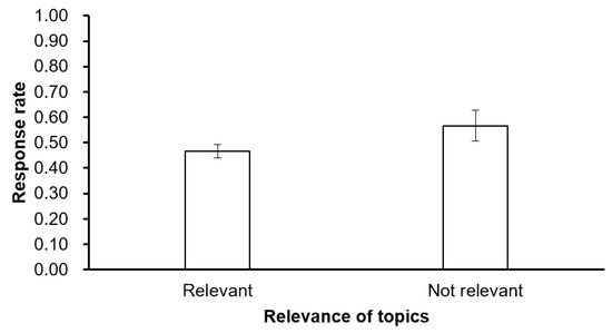 Contrary to our hypothesis, relevance of the topics was associated with lower response rates, F (1, 240) = 4.339, p = 0.038, with a mean response rate of 59.95% for studies on non-relevant topics and 49.43% for studies of relevant topics (Figure 5). Finally, the correlation between the number of items and response rates was not significant, r = 0.046, p = 0.478. We also examined non-linear relations between the two variables and found no significant results.