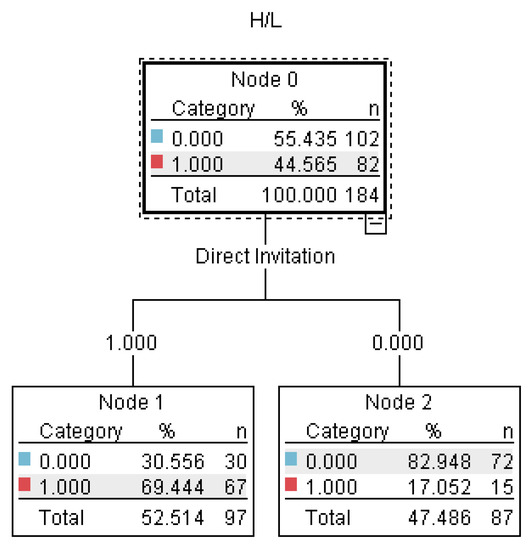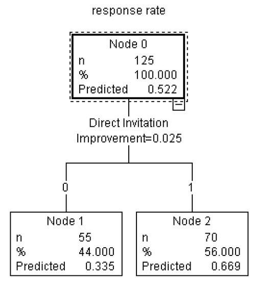 Finally, we compared our decision trees model with a prediction model based on traditional logistic regression. Results showed that the overall accuracy with the testing dataset was 73.10%, which was lower than the accuracy of our model (78.26%). Consistent with the results of the decision tree model, direct invitation had the highest importance (β = 2.506, p = 0.002), followed by mode of data collection (p = 0.582), and type of survey sponsors (p = 0.741).