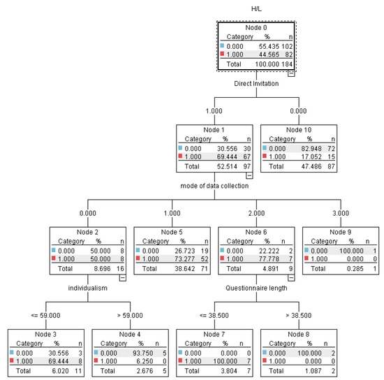 Of all the predictors, direct invitation had the highest importance, followed by mode of data collection and individualism. The length of survey was also important. Figure 7 shows the details of the decision tree and Figure 8 was the decision tree after pruning. Results showed that “high” response rates were obtained when using direct invitation (70% with direct invitations vs. 17% without). Of those with direct invitations, face-to-face interview and mail survey led to “high” response rates for 78% and 73% of the studies as compared to 50% and 0% for telephone and online surveys. For telephone surveys, individualism was a key factor, with lower individualism countries (59 or lower scores) leading to “high” response rates (69%), whereas all five surveys conducted in higher individualism countries showed “low” response rates. For face-to-face interviews, the length of survey was a key factor, with shorter surveys (fewer than 39 items) leading to “high” response rates (all seven studies, 100%), whereas all longer surveys (more than 39 items) showed “low” response rates.