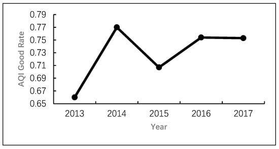 Figure 1 below shows the good rate of overall air quality (the ratio of air quality rated as Level I or II in Table 1) in Shanghai from 2013–2017 [,,,,]. It can be seen from the figure that since 2013, Shanghai’s air quality has shown an improvement trend, despite a slight decline in 2015, which was mainly due to the fine particle pollution (PM2.5) during autumn and winter, and ozone (O3) pollution during summer.