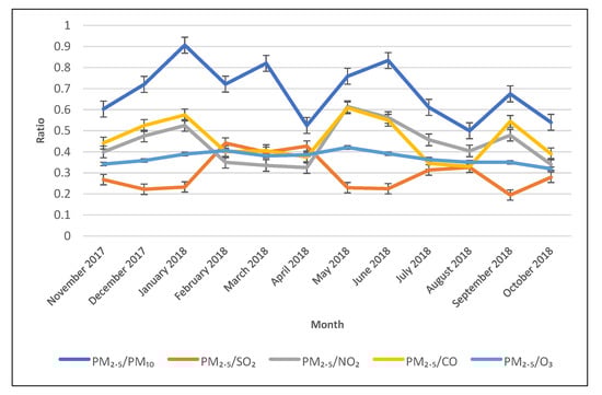 Ratio of PM2.5/PM10, PM2.5/SO2, PM2.5/NO2, PM2.5/CO, and PM2.5/O3 by month.