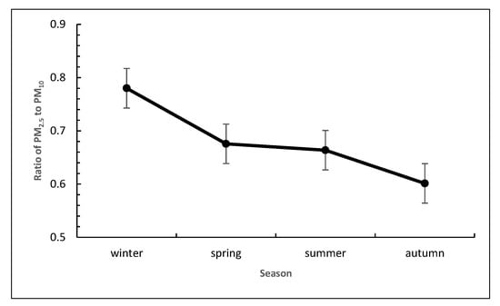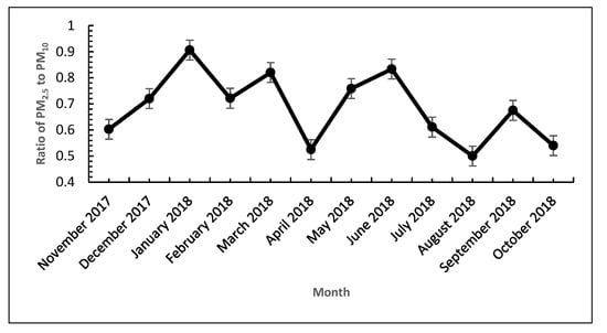 Hence, we will focus on the correlation between PM2.5 and PM10 concentration in Shanghai. The ratio of PM2.5/PM10 in Shanghai ranged from 0.50–0.91 during the study period [,]. The monthly ratios are shown in Figure 3 below, which was highest in January and lowest in August. Overall speaking, the ratios were volatile, with an average value of 0.68. Among the 90 pollution days in 2017 as published in 2017 Shanghai Environmental Bulletin, there are 25.6% of the days in which fine particles (PM2.5) was the primary air pollutant [].
