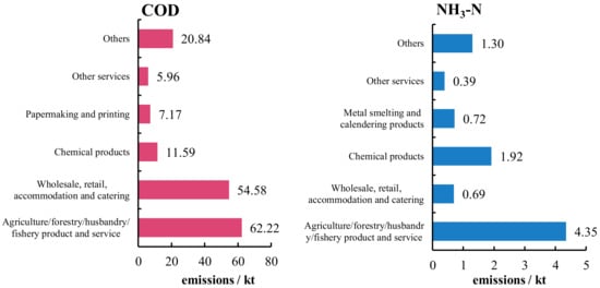 On the other hand, the release of potential water pollutants was also predicted to increase during the Soil Plan’s implementation period, with emissions of COD and NH3-N rising by 1.62 × 105 t and 9.36 × 103 t, respectively. In addition, the Agriculture, forestry, animal husbandry and fishing, Wholesale and retail, and Chemical products contributed a total of 79.1% and 74.3% of new COD and NH3-N emissions, respectively (Figure 2). Moreover, the Metal smelting and calendering products would cause 0.72 kt of new NH3-N emissions. As illustrated in the 2015 Bulletin of National Environmental Statistics [27], the amount of emissions of COD and NH3-N were 2223.5 × 104 t and 229.9 × 104 t, respectively. During the implementation of the Soil Plan, new COD and NH3-N emissions were equivalent to 0.73% of yearly emissions in 2015, respectively.