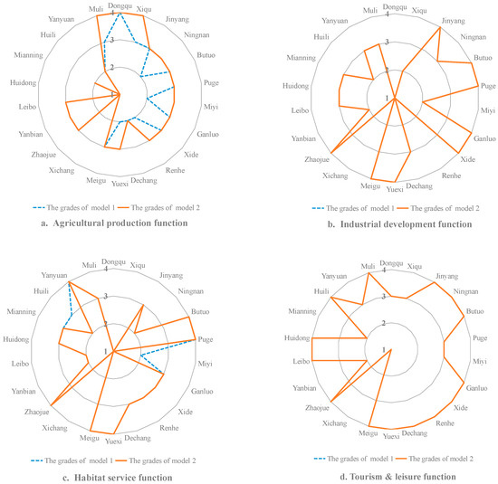 Comparing the two sorts of grades for FSoTS, calculated on the model 1 and model 2 respectively, shown in Figure 3, the performances of three FSoTS were different. Specifically, the industrial development function (Figure 3b), tourism & leisure function (Figure 3d), and mineral resources supply function (Figure 3e) presented the same spatial distribution, while that of the agricultural production (Figure 3a), habitat service (Figure 3c), and ecosystem services functions (Figure 3f) were characterized differently. Particularly, the grades for FSoTS of agricultural production in four evaluation units decreased by 1 level and that of habitat service in two evaluation units increased by 1 level. Moreover, the grades for FSoTS of ecosystem services in nine evaluation units and one districts decreased by 1 level.