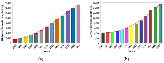 The past decades have witnessed an unprecedented period of growth in tunnel construction in China. By the end of 2017, the number of highway tunnels in China was 16,229 and the total length was 15,285 km [1,2]. In the same year, the number and the total length of railway tunnels in China were 14,547 and 15,326 km [3,4,5]. The total length statistics of highway tunnels in China from 2005 to 2017 are shown in Figure 1a, and the total length statistics of railway tunnels are shown in Figure 1b. At present, China has developed into one of the countries with the largest tunnel scale, the largest number of tunnels, the most complex tunnel structure. and the most complicated tunnel construction technology in the world [6,7,8,9,10,11,12].