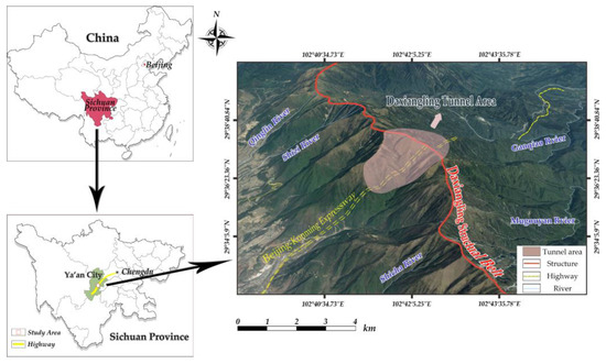 Daxiangling tunnel is a typical project of road tunnels in the western mountainous area of China and the important control engineering project of the Beijing-Kunming expressway. It is more than 10 km in length and is located in the middle of Ya’an City of Sichuan province. In terms of topography and geomorphology, Daxiangling tunnel belongs to the middle and high mountain area on the edge of the basin between the Sichuan Basin and the Qinghai-Tibet Plateau. Within the range of the tunnel area, the ridge valley extends in the far distance. The valley is steep and deep, along with having great differences in elevation. The average elevation in the tunnel area is about 2800 m and the elevation of the highest point is 3388 m. Daxiangling structural belt is a natural watershed with a steep hillside traversing the middle of the Daxiangling tunnel toward the northwest. There are many multiple terraces on both sides of the Daxiangling tunnel.