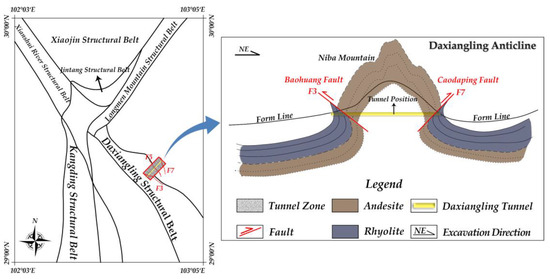 The Daxiangling tunnel area is located on the SE side of the Y-shaped structural area, which is influenced by multiple secondary structural units, such as Longmen mountain structural belt, Xiaojin structural belt, Xianshui river structural belt, Jintang structural belt, and Kangding structural belt. Its structural unit is Daxiangling structural belt. The Daxiangling anticline is the controlling structure of the tunnel area, which is bounded by the Caodaping fault to the northeast and the Baohuang fault zone to the southwest. The nucleus of the Daxiangling anticline is raised and its wings are roughly symmetrical. The regional structure of the Daxiangling tunnel area is given in Figure 3.