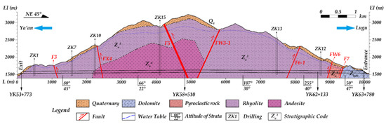 The strata passing through the Daxiangling tunnel of the area are mainly magmatic strata and sedimentary strata. The lithology of the lowermost stratum of the Daxiangling tunnel is andesite and rhyolite of the Lower Sinian, which are followed by pyroclastic rock and dolomite of the Upper Sinian. The regional surface is covered with the Quaternary stratum. The sequence and lithology of each stratum are given in Figure 4 and Table 3 for the corresponding rock types.